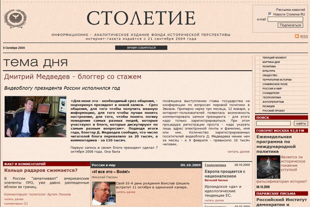 Интернет-газета «Столетие». Издаётся с 21 сентября 2004, cвидетельство о регистрации средства массовой информации ИА № ФС77-23029 от 21 сентября 2005. Является информационно-аналитическим изданием Фонда истрической перспективы. Фонд исторической перспективы (ФИП) — российская неправительственная, некоммерческая организация национально-консервативного направления, учрежденная в апреле 2004 года депутатом Государственной Думы РФ, доктором исторических наук Н. А. Нарочницкой.