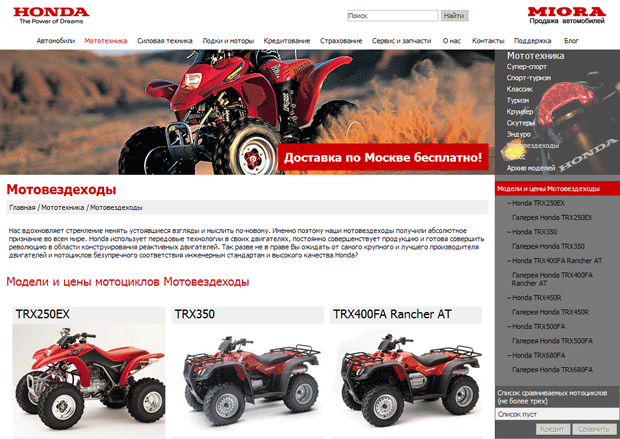 Продажа автомобилей, мотоциклов, силовой техники, лодок и моторов компании Honda Motor. Кредитные программы. Функциональность